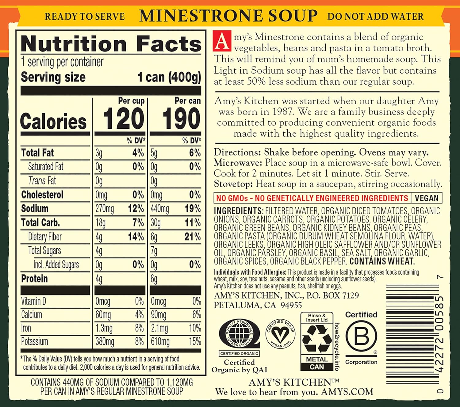 Amy’s Minestrone contains a blend of organic vegetables, beans and pasta in a tomato broth. It will remind you of mom’s homemade soup.