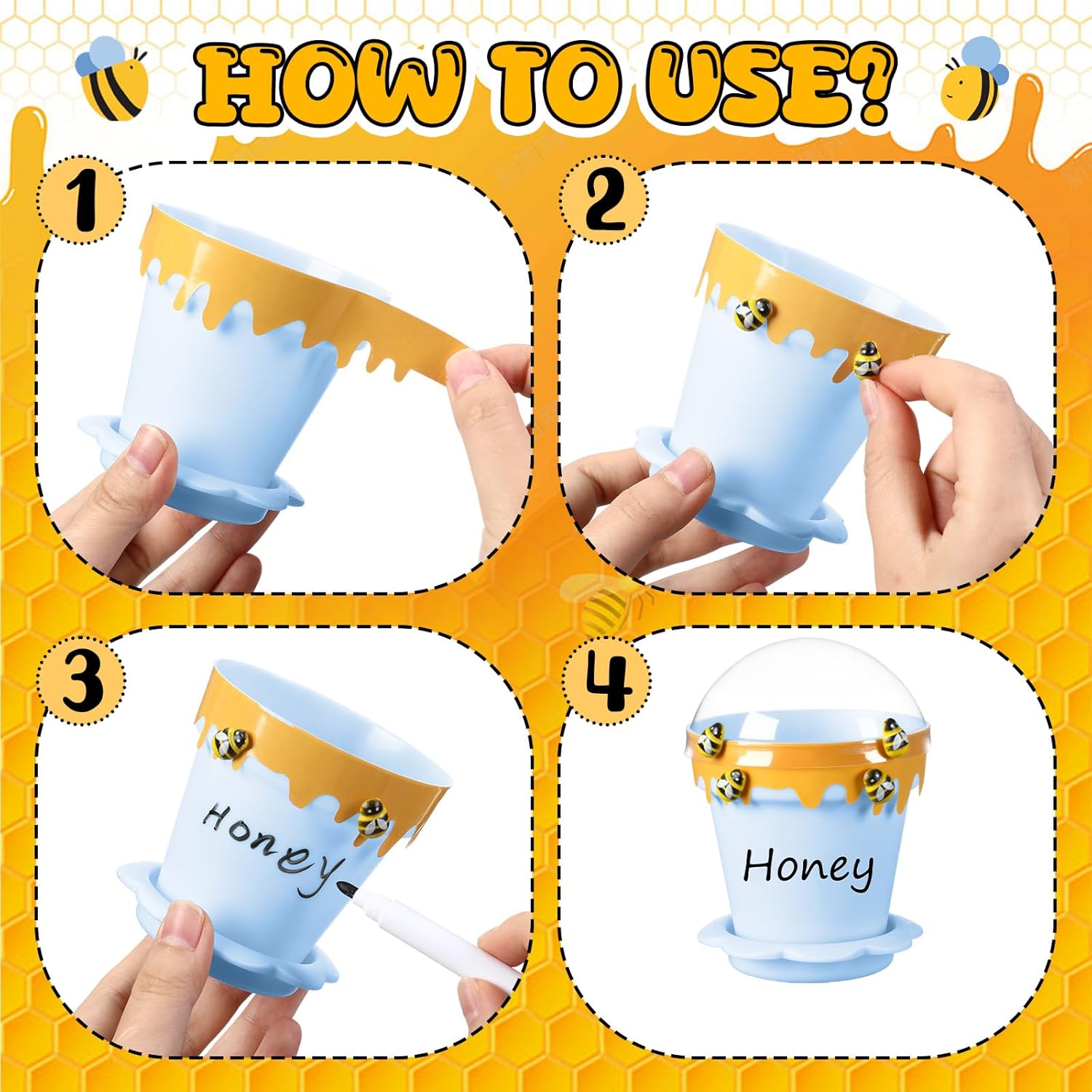| Included Components | 30 Lids, 30 Mini honey jars party favors, 30 Saucers,30 Shovel shaped spoons, 30 Stickers,120 Wooden yellow bee decoration, 4 Erasable markers,2 Indelible markers |
